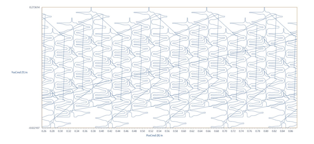 The system was configured using the standard Automation1 setup wizards (MachineSetup, commutation, encoder tuning and EasyTune on the aggressive setting). The profile (shown in Figure 4) used lookahead and velocity blending, which are critical for maintaining the desired vector velocity along the stent’s complex contours. Multiple runs were conducted with varying ramp and feed rates.
