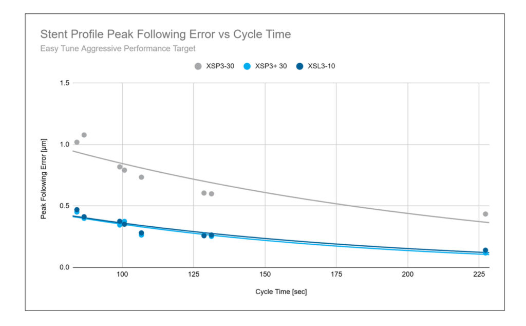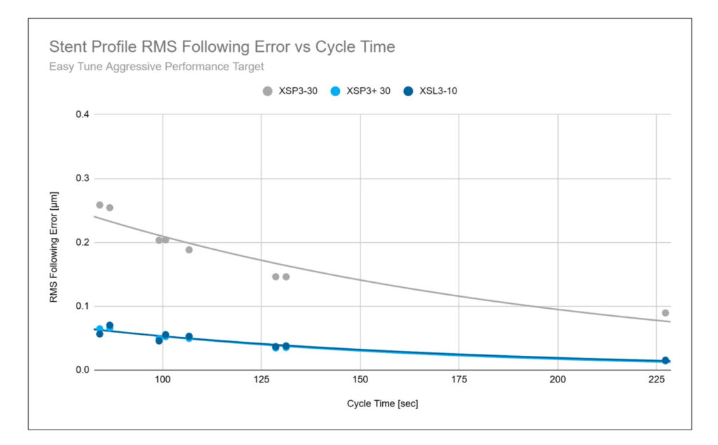 The plots in Figure 5 show the relationship between cycle time (throughput) and the magnitude of following error (precision/quality) for all three amplifier types. Each point on the plot represents a different ramp and feed rate for the same stent profile.