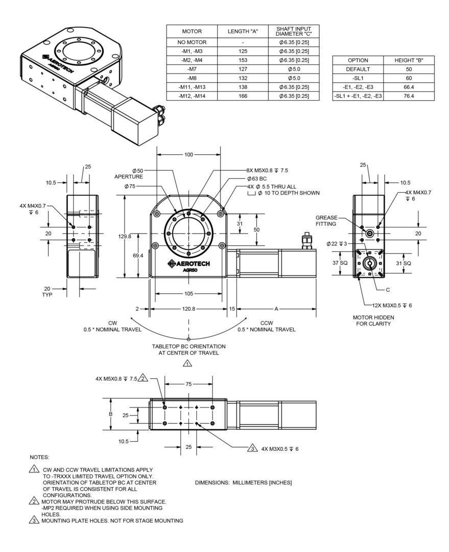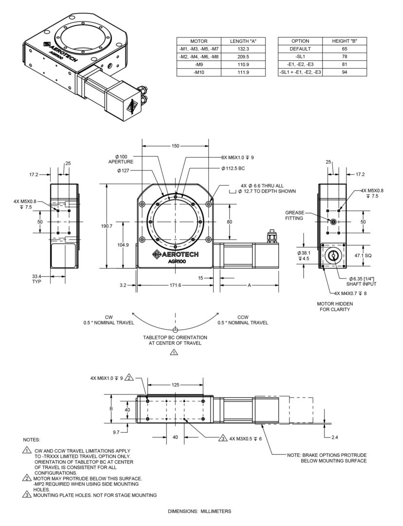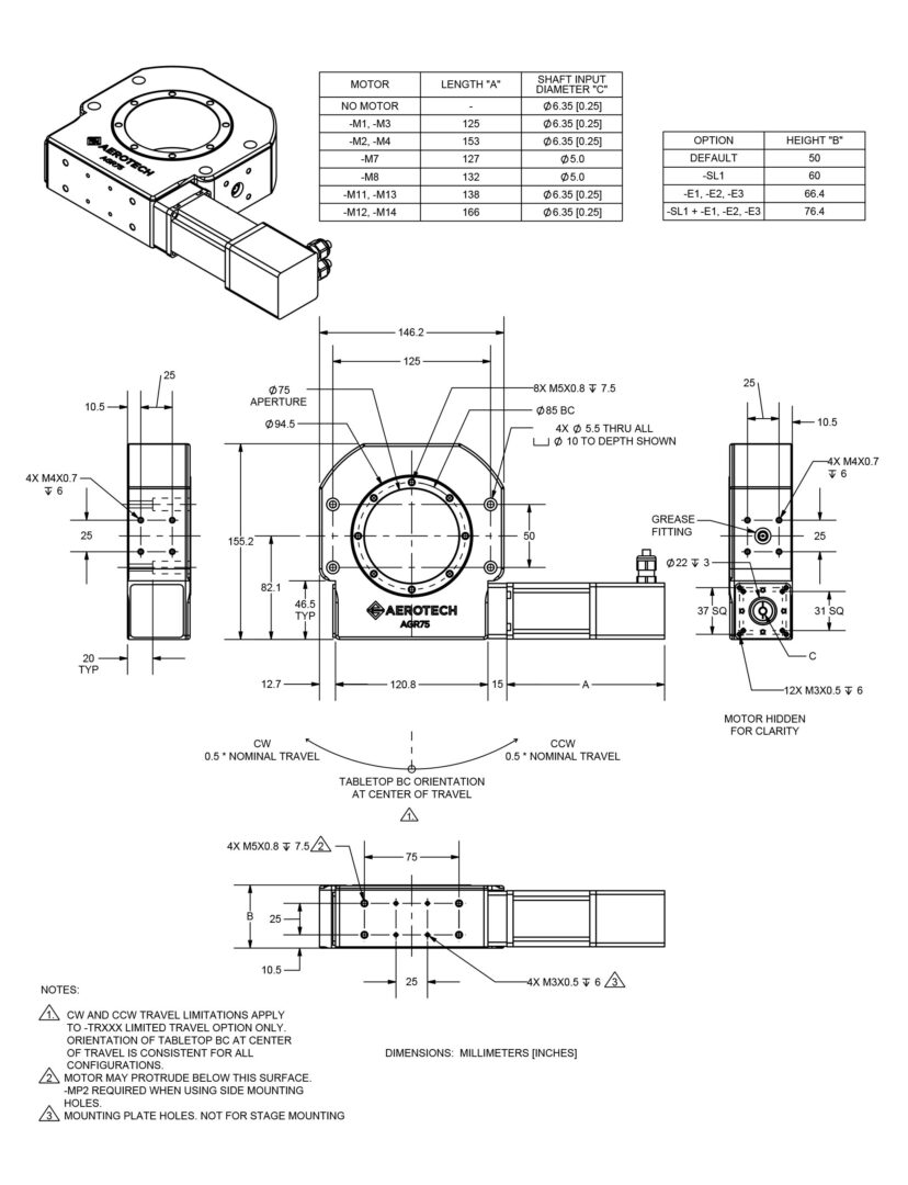 - Other motor location and orientation options are available upon request. Contact Aerotech for more information.