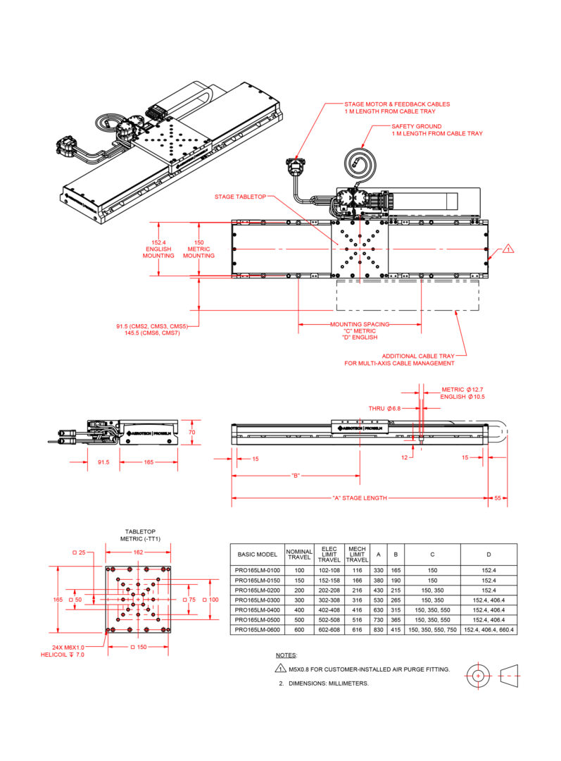 The PRO165LM’s many standard features and options make it incredibly flexible, so you can easily tailor it to your application. The base mounting holes are accessible from the outside of the stage, allowing for easy mounting to both metric and English optical tables and other interfaces. The stage tabletop comes standard with a metric mounting pattern to accommodate your payload, process equipment or even another axis of motion.  Multi-axis assemblies are now easier than ever to build and integrate, thanks to a variety of configurable cable management options. Plus, PRO165LM stages can be prepared for use in special environments by request. Contact us to learn more about compatibility in vacuum chambers, cleanrooms and more.